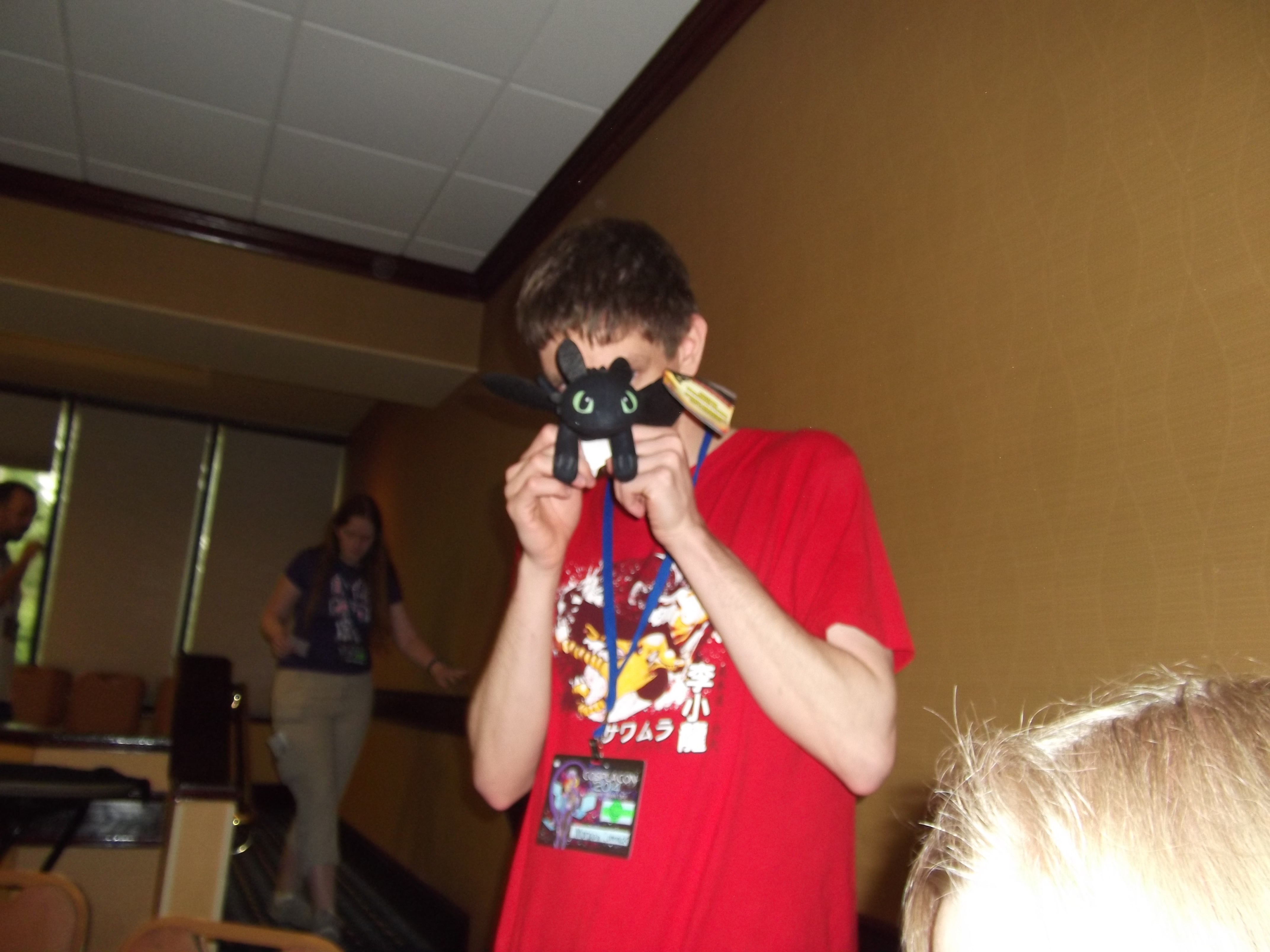 We rested in the room for a bit and then around 6:00, we went to an event I got invited to on the Cosplacon facebook, called a tasty social, where they promised homemade cupcakes. Not too many events were happening Thursday, but people were coming and the room was full. There was a nice guy in a ninja outfit and mask named Alex as our host. I gave him my snack cakes I bought to help out and he was very grateful. Sadly, the event fell to pieces for our poor ninja. 🙁 Several people in the room were loud and rude, talking and laughing while Alex-san was trying to talk about their social group and the games for the panel. He was quiet and because he was talking through his cloth ninja mask, it was near impossible to hear him. He had a presentation, but the person in charge forgot to get and it was 20 minutes late and then they could not set it up. We tried to play a game where we wrote down things about ourselves and a random number. They were shuffled and the point was for us to get up and introduce ourselves to new people to see who the card belonged to. The winner, who figured their person out first, got to eat first from the pastry paradise and the second place winner won a Toothless from How to Train your Dragon plush. Well, someone in our group for a super easy, giveaway card and figured out their person right away. So, guess who for second place? DERRICK! =D He won Toothless and he LOVES that film, so he was playing with him all weekend. The game as confusing and all people talked about was getting food. I must admit, they were the best cupcakes I have ever had! They sure can cook! Yummy! ^o^ I did talk to two girls who were starting X and Y and wanted tips, a Big Bang theory fan, a guy who was impressed with all my Sailor Moon knowledge, and a cute teen girl who asked to hug me and gushed over all my Sailor Moon items (I had on my new Sailor Inner Scouts shirt, my Sailor Moon S heart locket, and my Sailor Moon S all scouts purse). ^_^ They tried really hard and I am grateful for all they did, taking a business card of course, but they lost the audience from the start and it was a lose cause. My teacher instincts to disciple were tingling so bad I had to clutch my fist on my jeans, but that would make me rude. I give this panel a 5 out of 5 and wish them luck in their business.