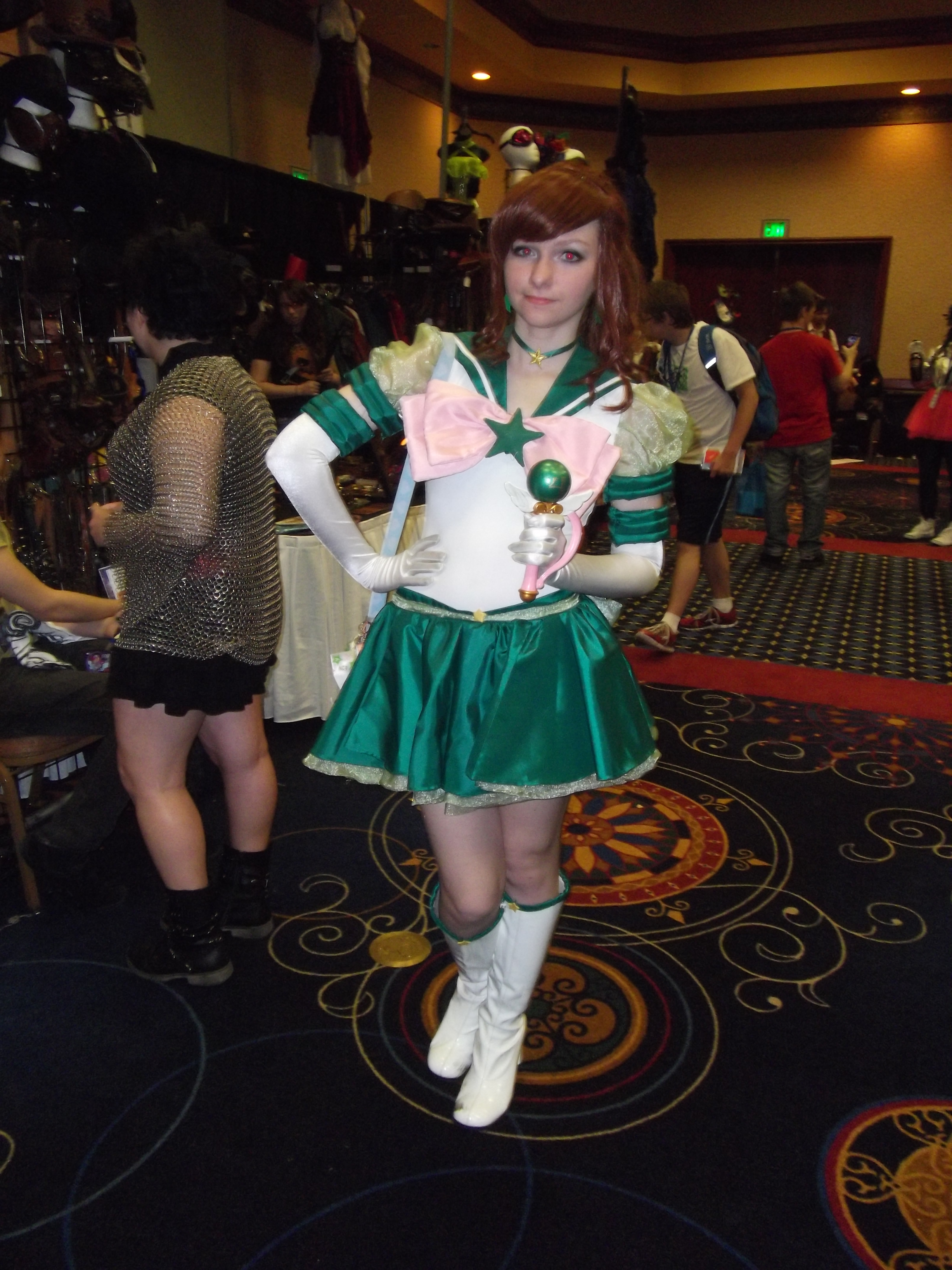 Anyway…because of this drama, I could not sleep anymore or choke down my Coco Puffs Nathan was nice enough to get for me. At 8:45, I got the boys up slowly and started getting ready for my cosplay around 9:30. I was Sailor V for Friday, her seeming to be my trademark character. I love being her a lot, but I hope to be someone just as awesome and recognizable next year too. Decisions… But, Sailor V’s cosplay has A LOT of parts, so it takes me longer than I would like, like half an hour, but I always have fun with it. We left at 10:00ish to go see Tabby’s secret surprise cosplay she has been making painstakingly for almost a year now…