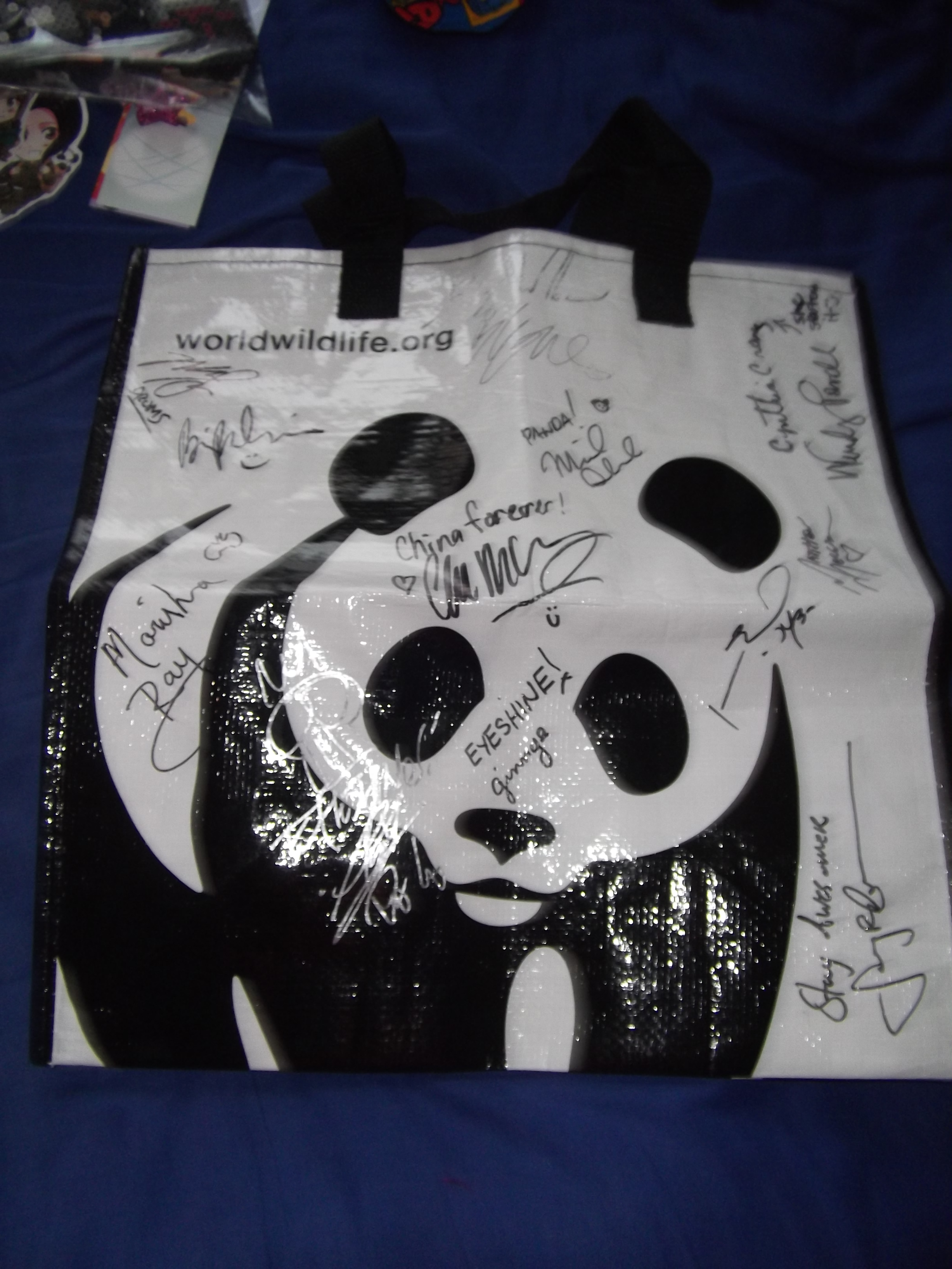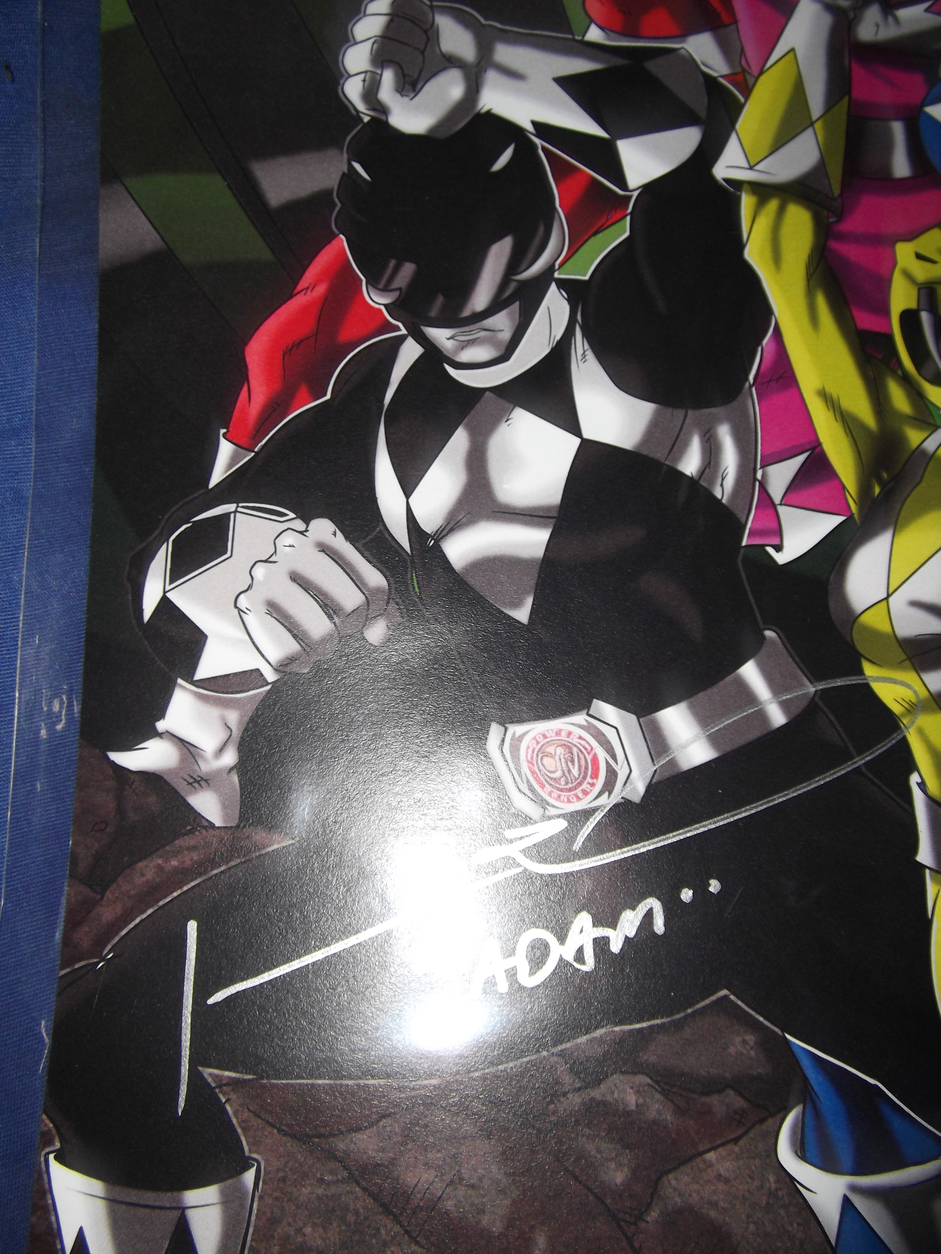 After we all got dressed, we headed down. Nathan, and Tabby had a panel to go to and Miles and his pals were going to head to the “Eyeshine is Neato” panel with Johnny’s band when we noticed their booth was opened. They had tons of prints for sale (pricey, but at least they were good quality). I decided to purchase one, a Power Ranger one that would look neat next to my Power Ranger print in my bedroom I got last year. Miles got a small one too. I figured you get one, pay, and then go since they had a panel and their scheduled autograph time wasn’t until Sunday. Still, I paid and the lady told me Johnny would only sign one item per line visit. I was confused, but the line kept moving and Miles was in front of me. There, at the end, was Johnny. Poor Miles was trying to put his wallet pack in his Li Syoaron backpack and the line moved, shoving his both and he dropped all his stuff. When I mean all his stuff…I mean ALL his stuff and it was right in front of Johnny. Miles, who is always Mr. Calm and “I can care less” looked super flustered and bent down to pick it up. Johnny got out of his chair to bend down and make sure Miles was okay, a sweet, small smile on his face. Miles didn’t see this, but I did and it made me smile. Miles grinned like I normally do with voice actors and pointed to the Eyeshine CDs at the table as Johnny signed his picture. Miles strutted a little, but I was proud at how well he did; he is a Johnny fan boy (in a respected way). He said, “I…I have all your CDs but the newest one.” Johnny smiled again and it reached his eyes this time. He told Miles, “You have good taste in music man. Thanks.” Johnny was much more business-like with me and zipped through me, but I called him Mr. Bosch and told him I was working with Dan. I’m not sure he even looked at me to be frank. He’s a huge star so I understand that and I was really happy to meet him, but I think because I didn’t brace myself to meet him, I didn’t have a chance to get excited/nervous butterflies like I normally do. Or I’m getting used to meeting stars. Not sure. He signed my picture (the other one was sadly in my room, but I saved it for Sunday), “Adam- It’s Morphin’ time.” I think his name is a line with a loop in the center! HA! =O Not sure what to think on that. Still, it was an honor to meet a childhood icon early.