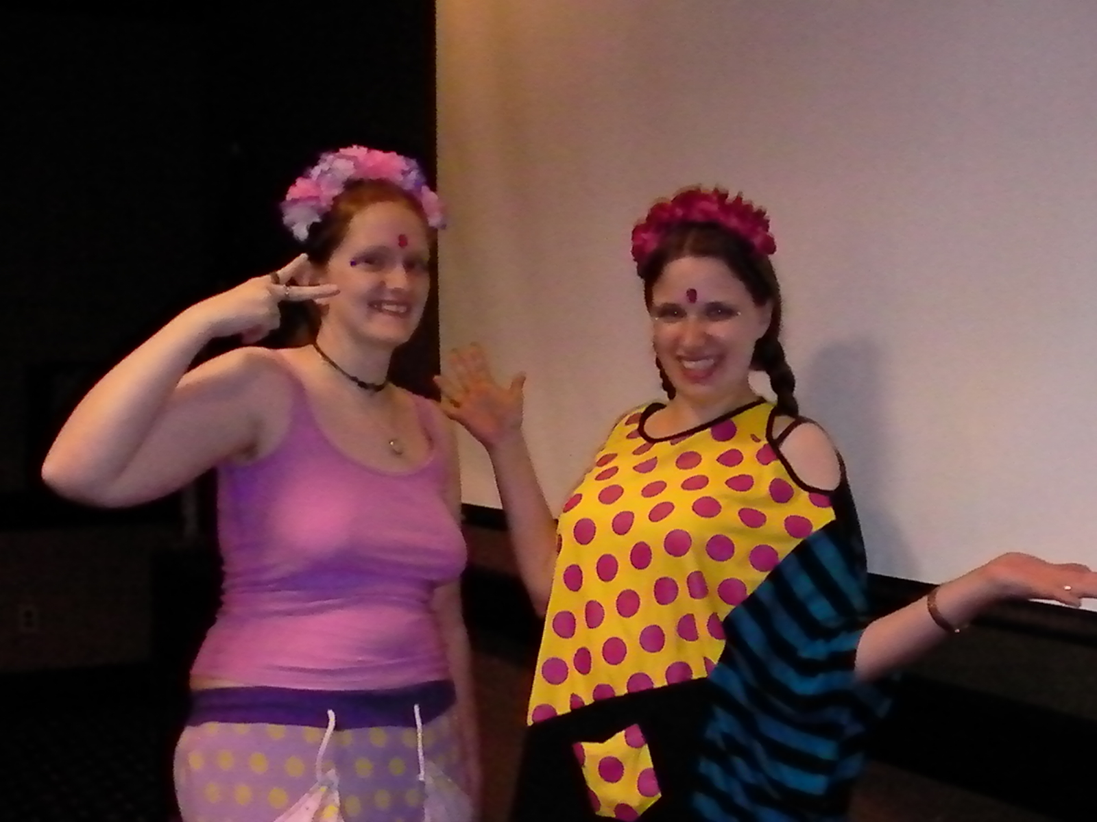 I found my friend Sage’s room, the one who was running the Tokyo Street Fashion panel and her room was an array of chaos. I texted Tabby the room and we took over the bathroom. Sadly, Sage and her friends are super thin, so Tabby and I, being bigger than her, didn’t get the super cute Lolita clothes like I thought, but some…interesting looks. Sage, a sweetheart, kept apologizing because she was running around trying to get eight girls dressed in a tiny hotel room. I pulled Tabby in the restroom with me and we changed. The pictures are here and maybe I didn’t look sensual or flattering, but I had to giggle at myself and I decided to have as much fun as possible and I had to admit, once I got used to the bold colors of my Tokyo clown attire, I liked it and other than the pants being a bit snug, it fit me well. Sage put heavy blue eye shadow on me and rub on glitter on my cheeks. I also had jewels stuck on my forehead and by my eyes and the final kawaii touch, one of Sage’s darling, custom-made flower crowns. Tabby had similar pants to mine in style, but they were pale pink and purple with unicorns all over them, her shirt basic.