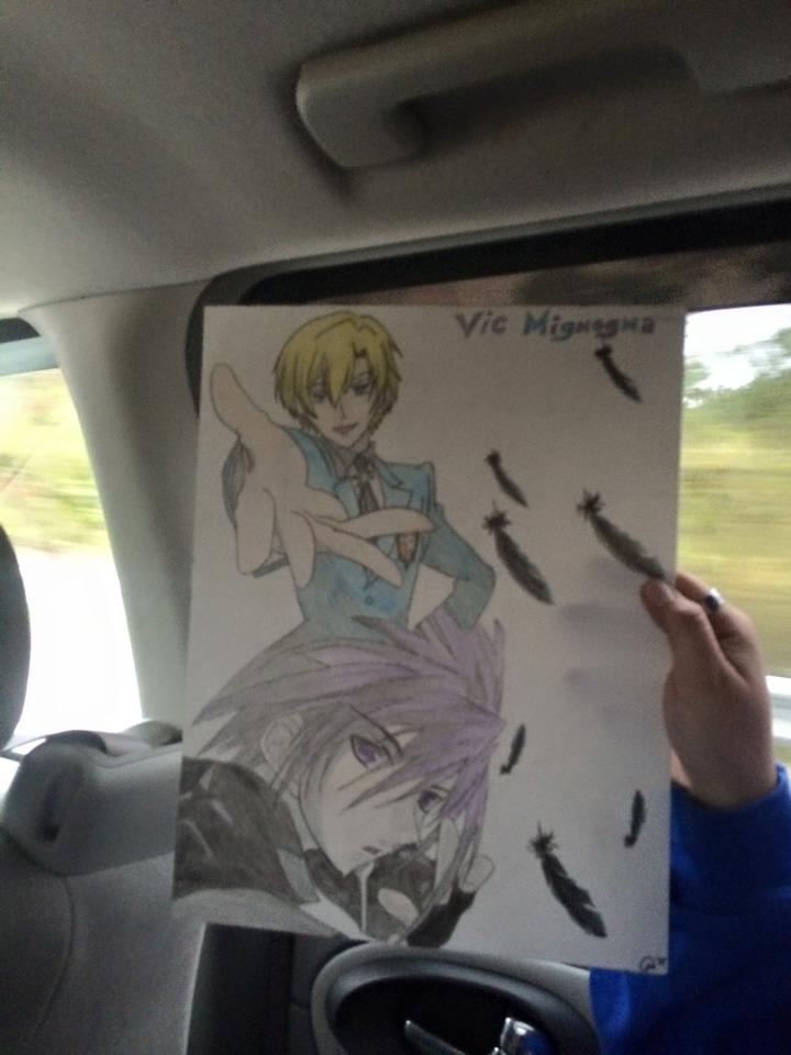 J. Michael is very fashionable to me so although I wanted to get him as many Jack in the Box coupons as possible and a car bobble because he loves Jack in the Box and Derrick works there, but that didn’t happen. So! I got a light bulb to get him a hat. I don’t know why, but, whatever. I rolled with it and spent 20 minutes at Wal-mart trying on guy’s hats to see which one worked well on what I envisioned was his head. I’m sure it looked odd. I, funnily enough, bumped into my dad and he liked the hat, which surprised me for it was a combination of a paperboy hat and an artsy one. I did leave the receipt in their just in case. He told me that was thoughtful and thorough. I also found him purple roses for Kyoya from Ouran High School Host club, the first character I heard him as. I DID color J. Michael pictures too; I forgot to get a picture of it before I gave it to him though. -_-;; I was sadly rushed for time.