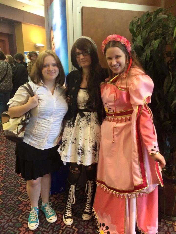 Julie, Miles, and I tried to sleep, but it was hard. This did not surprise me, however, since I never sleep well at hotels or other people houses. We got up on Saturday morning at 6:00 to work out the shower scheduling, ate a bland breakfast in a room that was filled with upper elementary soccer kids with their parents and younger siblings taking over (it was nuts). To appraise mom, because we love our mother very much, Miles and I wore our first cosplays from 2012: Our Tsubasa Reservoir Chronicles from the “CLAMP in Wonderland” music video (mine was from a manga cosplay). Miles was Fai, the magician Vic plays in the show (AKA: Big Cat) and I was Princess Sakura AKA Jingles for this was the outfit with all the jingle bells. Sadly, it barely fit, but I was able to manage although it was tight. >.<