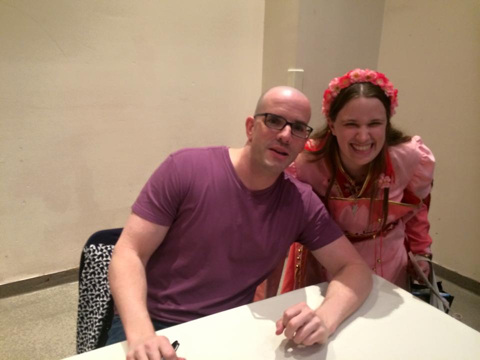When we looked back at the 50 minute mark of the panel to see how insane the line was, Miles, Julie, and I decided to go stand back there, making us in the fourth line already made! Although some people were cutting in front of us (even when I told them we were in line. By the fourth time this happened, I was dragging Miles with me every inch and getting a tad territorial and showing teacher dagger eyes. It seemed to work). I DID see my friend Zelda! 😀 She was the postman from The Legend of Zelda series and she looked grand. She was supposed to get her green milkshake I promised her from Anime St. Louis with us, but she looked tired and ill, so she went home after she got her items signed. 🙁