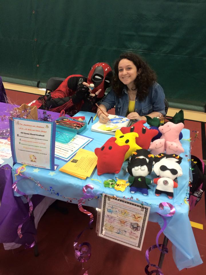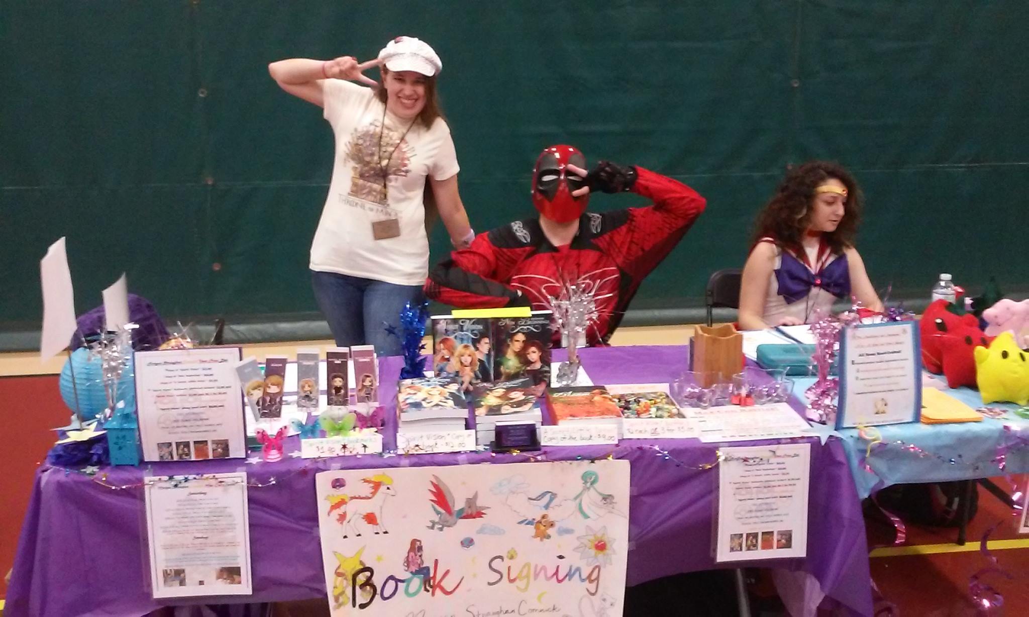 My wonderful friend and Poke Crew member Andrew as paint ball Deadpool, Rhiannon (it was her first con ever and I needed help running my guest table. She also made homemade plushies and other kawaii, crafty things to attract the eye), and I showed up at 7:00 to set-up. We decorated our table with purple and stars and had some raffles going on: play UNO against Team Magma, Pokemon Sorry agaisnt Sailor V and Sailor Mars, and to be an important character an upcoming, published short story of mine.